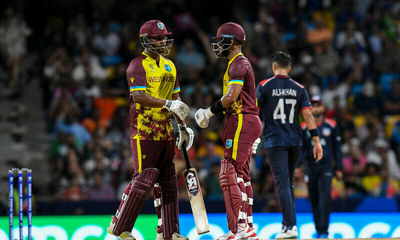 Hope went instantly on to the attack for West Indies, stroking the ball to all parts of the field to reach his half-century in 28 balls with four sixes and four boundaries as the US fielders chased the ball in vain across the ground.