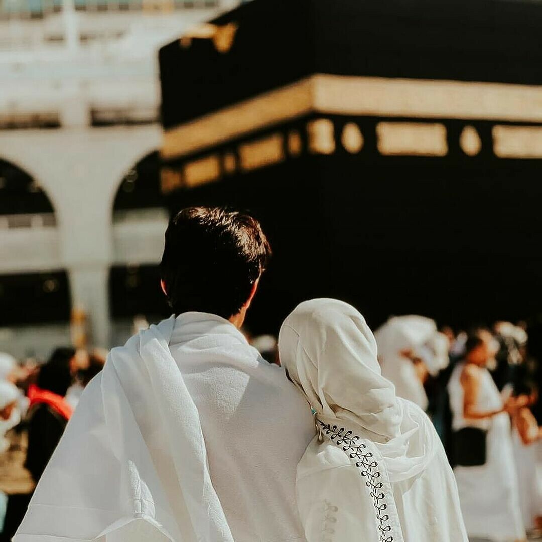 A second picture shows the couple in ihraam — the garb needed to perform pilgrimage — standing before the Kaaba.