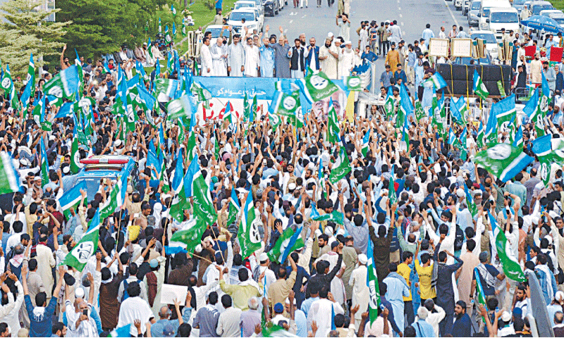 The JI had initially announced it would hold an indefinite sit-in at D-Chowk overlooking Par-liament House — where PTI camped out for several weeks in 2014. However, owing to road blocks, party leader Hafiz Naeem only managed to make it to the Sector I-8 intersection.