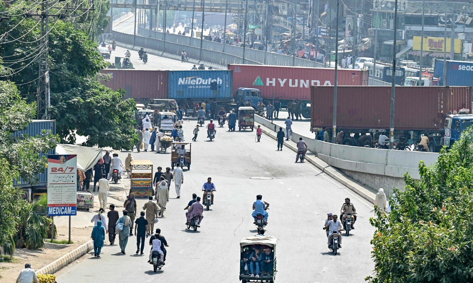 According to a Dawn.com correspondent in Islamabad, the major and link roads between the twin cities and entry points connecting from Motorway M1, M2 and Grand Trunk Road were still blocked by containers on Saturday.