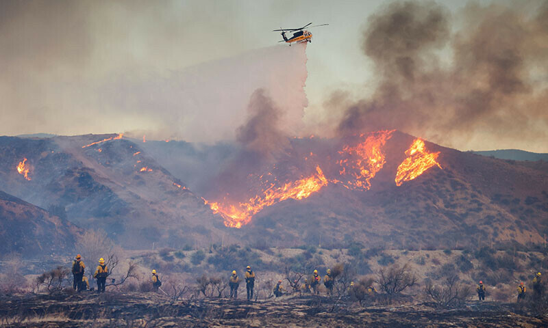 A helicopter drops water as the Hughes Fire burns in Castaic Lake, California, US on January 22. — Reuters