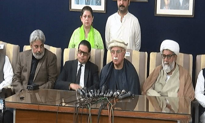 Achakzai was flanked by PTI Secretary General Salman Akram Raja, Majlis Wahdat-i-Muslimeen (MWM) chief Senator Raja Nasir Abbas, and Sunni Ittehad Council’s (SIC) MNA Sahibzada Hamid Raza.