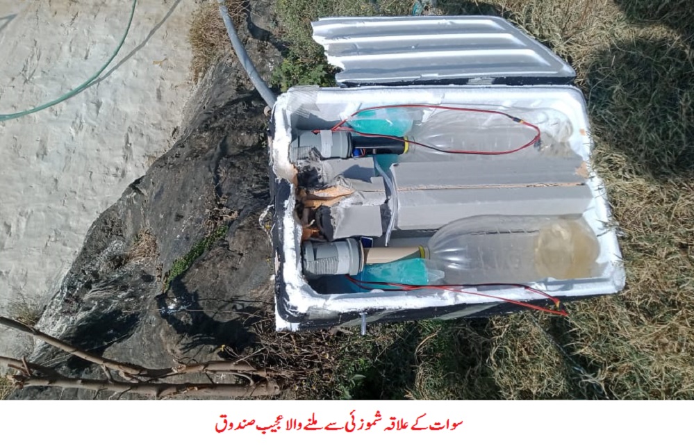 Barikot (From Riiaz Ahmed) Suspicious box falling from the sky in Shamuzi, spreading panic in the area. A suspicious box-like box has been recovered near the police check post Gowda within the limits of Shamuzi police station, which has spread a sensation in the entire area. According to eyewitnesses, this box came down from the sky through a plastic parachute, after which a wave of fear and anxiety spread among the locals.
